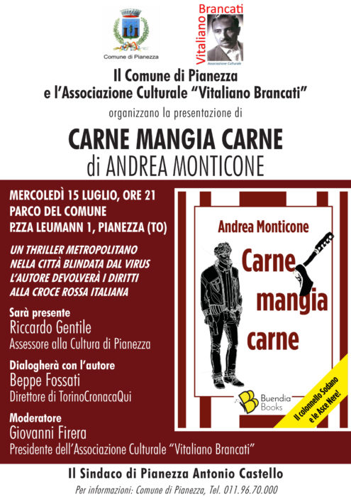 Il Comune di Pianezza e l’Associazione Culturale “Vitaliano Brancati” organizzano la presentazione di Carne mangia carne di Andrea Monticone (caporedattore del quotidiano CronacaQui e Premio Vitaliano Brancati 2020 per il giornalismo)