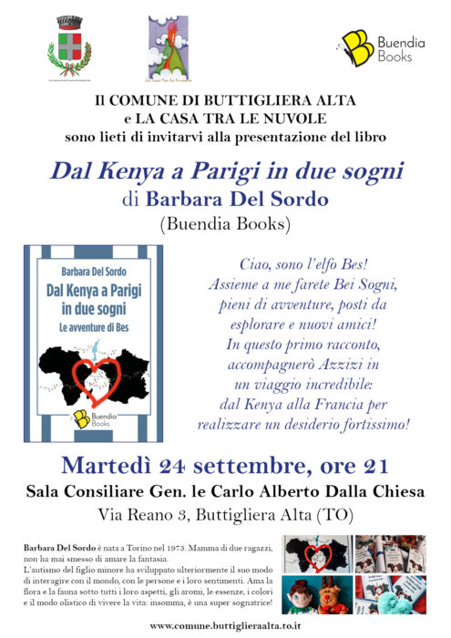 Il Comune di Buttigliera Alta e La Casa tra Le Nuvole sono lieti di invitarvi alla presentazione del libro Dal Kenya a Parigi in due sogni di Barbara Del Sordo!