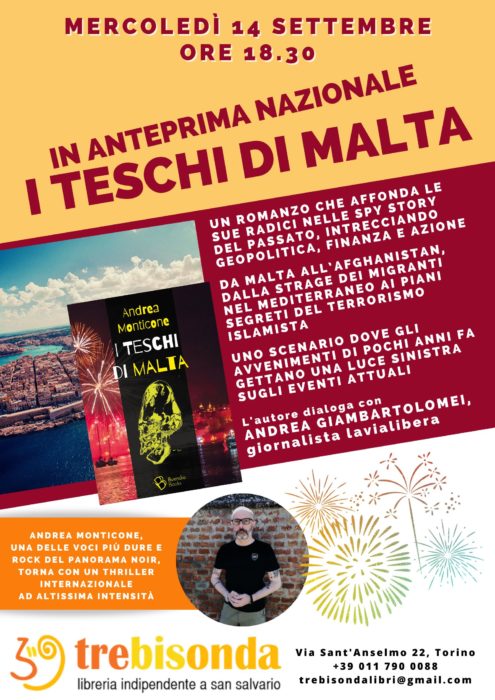 Mercoledì 14 settembre alle ore 18.30 Andrea Monticone presenta in anteprima nazionale I Teschi di Malta alla Libreria Trebisonda, in dialogo con Andrea Giambartolomei, giornalista lavialibera