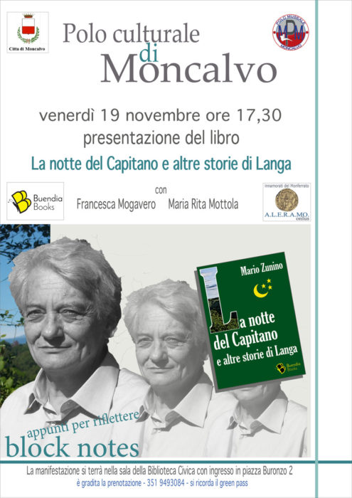 Venerdì 19 novembre alle ore 17.30 Mario Zunino presenterà La notte del Capitano e altre storie di Langa alla Biblioteca di Moncalvo, nell’ambito della rassegna “block notes – appunti per riflettere” a cura di A.L.E.R.A.MO. Onlus!