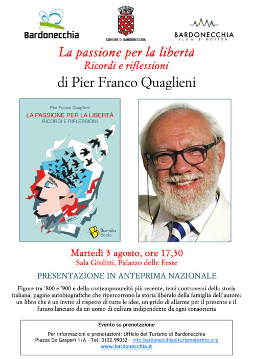 Martedì 3 agosto alle ore 17.30 La passione per la libertà, il nuovo libro di Pier Franco Quaglieni, sarà presentato in anteprima a Bardonecchia, presso la Sala Giolitti di Palazzo delle Feste.