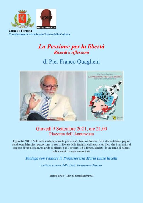 Giovedì 9 settembre alle ore 21 La passione per la libertà. Ricordi e riflessioni, il nuovo libro di Pier Franco Quaglieni, sarà presentato a Tortona, presso la piazzetta dell’Annunziata.
