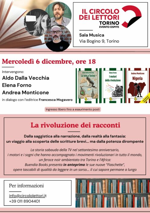 La storia sabauda della TV nel settantesimo anniversario, i motori e i sogni che hanno accompagnato i movimenti rivoluzionari in tutto il mondo, un feroce noir ambientato tra Torino e l’Africa: Buendia Books presenta in anteprima le sue nuove “Fiaschette”, opere tascabili di qualità da leggere in un sorso… il cui sapore permane a lungo