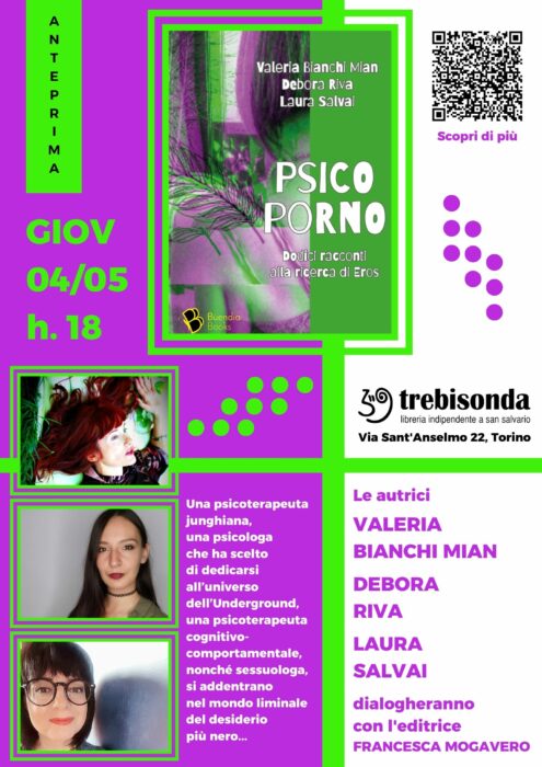 Giovedì 4 maggio alle ore 18, in anteprima nazionale, Valeria Bianchi Mian, Debora Riva e Laura Salvai presentano Psicoporno. Dodici racconti alla ricerca di Eros alla Libreria Trebisonda!