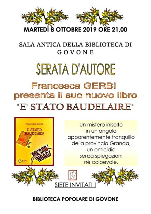 Un mistero irrisolto in un angolo apparentemente tranquillo della provincia Granda, un omicidio senza spiegazioni né colpevole: martedì 8 ottobre alle ore 21 Francesca Gerbi e il suo romanzo noir È stato Baudelaire saranno ospiti della Biblioteca di Govone, vi aspettiamo nella Sala Antica!