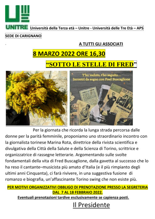 Per la giornata che ricorda la lunga strada percorsa dalle donne per la parità femminile, l’Unitre di Carignano propone uno straordinario incontro con la giornalista torinese Marina Rota, direttrice della rivista scientifica e divulgativa della Città della Salute e della Scienza di Torino, scrittrice e organizzatrice di rassegne letterarie.