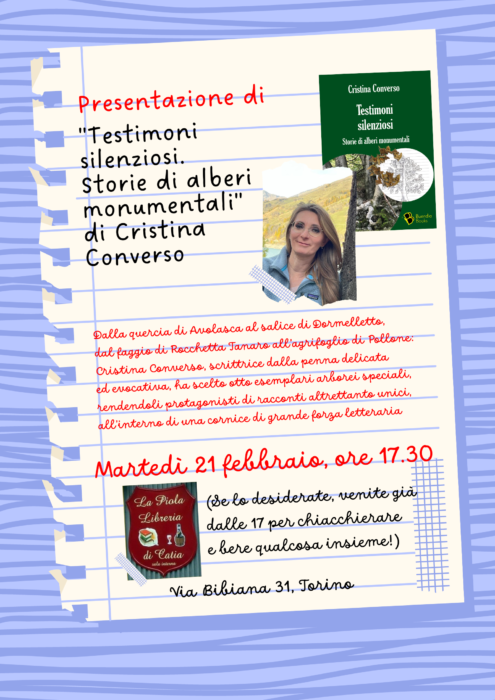 Martedì 21 febbraio alle ore 17.30 Cristina Converso presenterà Testimoni silenziosi. Storie di alberi monumentali, il suo nuovo libro, alla Piola di Catia (via Bibiana 31, Torino)! ![]()