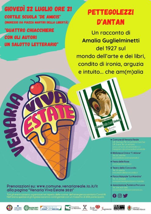 “Venaria Viva Estate”, la rassegna promossa dal Comune di Venaria e dedicata alla musica, all’arte, ai canti, ai balli, alle mostre, è anche “Salotto letterario”, lo spazio ideale per fare “Quattro chiacchiere con gli autori”
